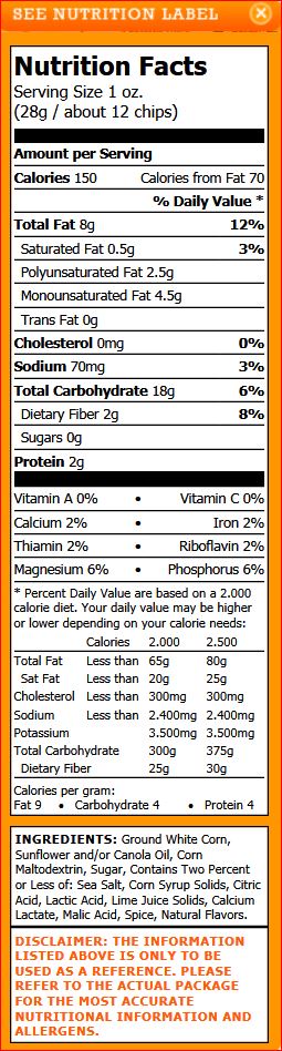 A good source of fiber, our crisp, delicious bite-size tortilla chips have no preservatives and 0 grams TransFat!