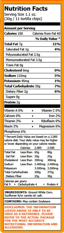 Ingredients: Ground White Corn, Sunflower &/or canola oil, salt. Contains: May contain Soybeans